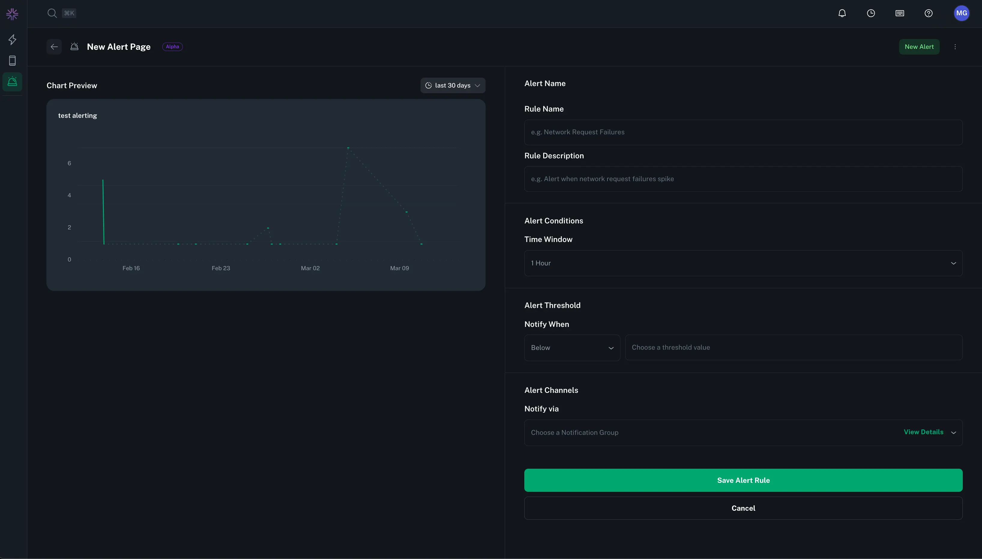 To create an alert, click on the options button of any workflow-powered Plot Chart. Configure the alert by providing a rule name, description, time window, and threshold. Then, select a notification group to determine where alerts will be sent.
