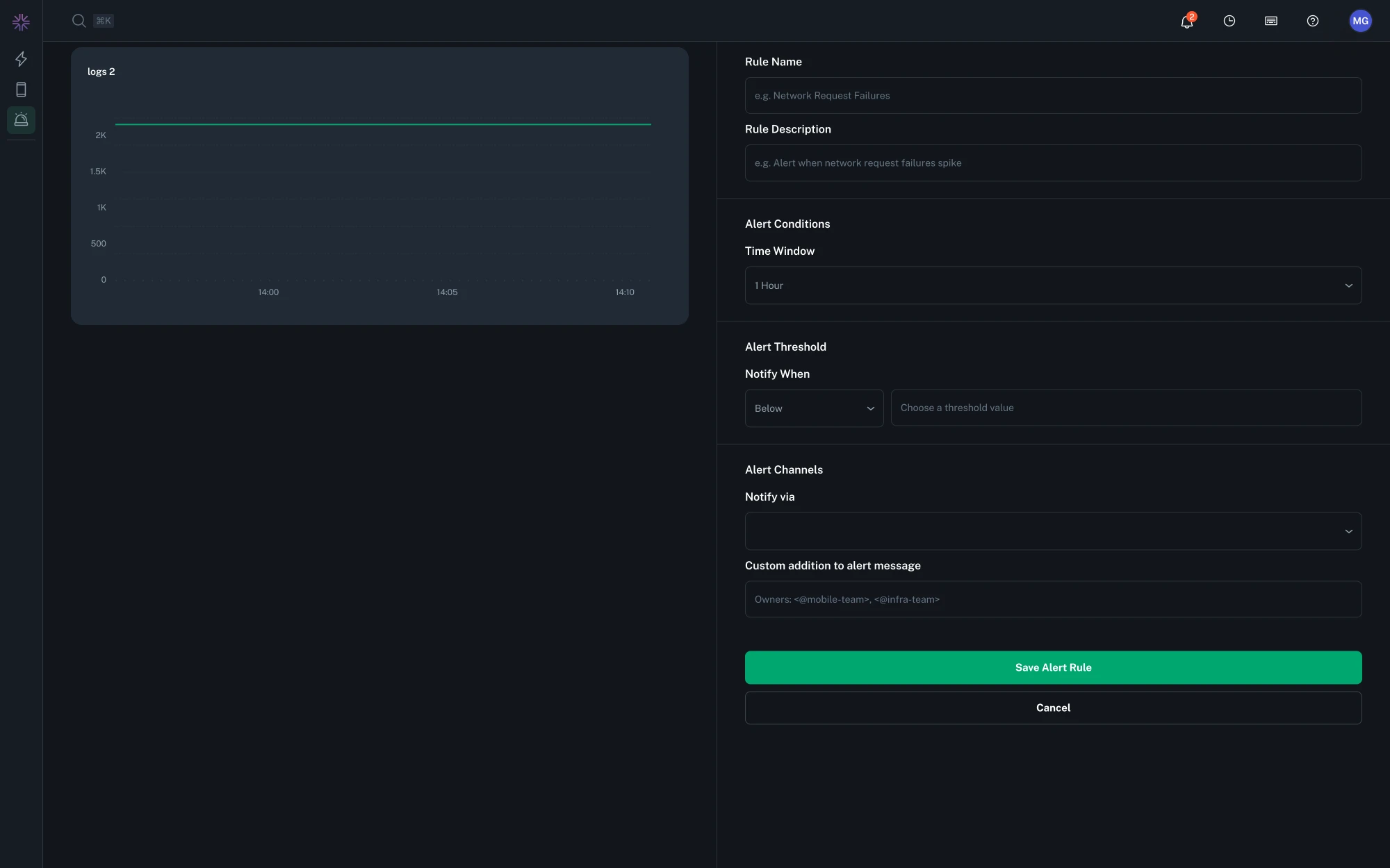 Enter the exact Slack notification that will be posted when the alert fires. • Message text: The custom text of your alert (e.g. “Error rate above 90% for service X”). • @mentions: Include any user or team pings using Slack’s mention syntax (e.g. <@U12345678> for a specific user, <!subteam^S12345|@dev-team> for a user group). For more info, check out the Slack mention syntax docs.