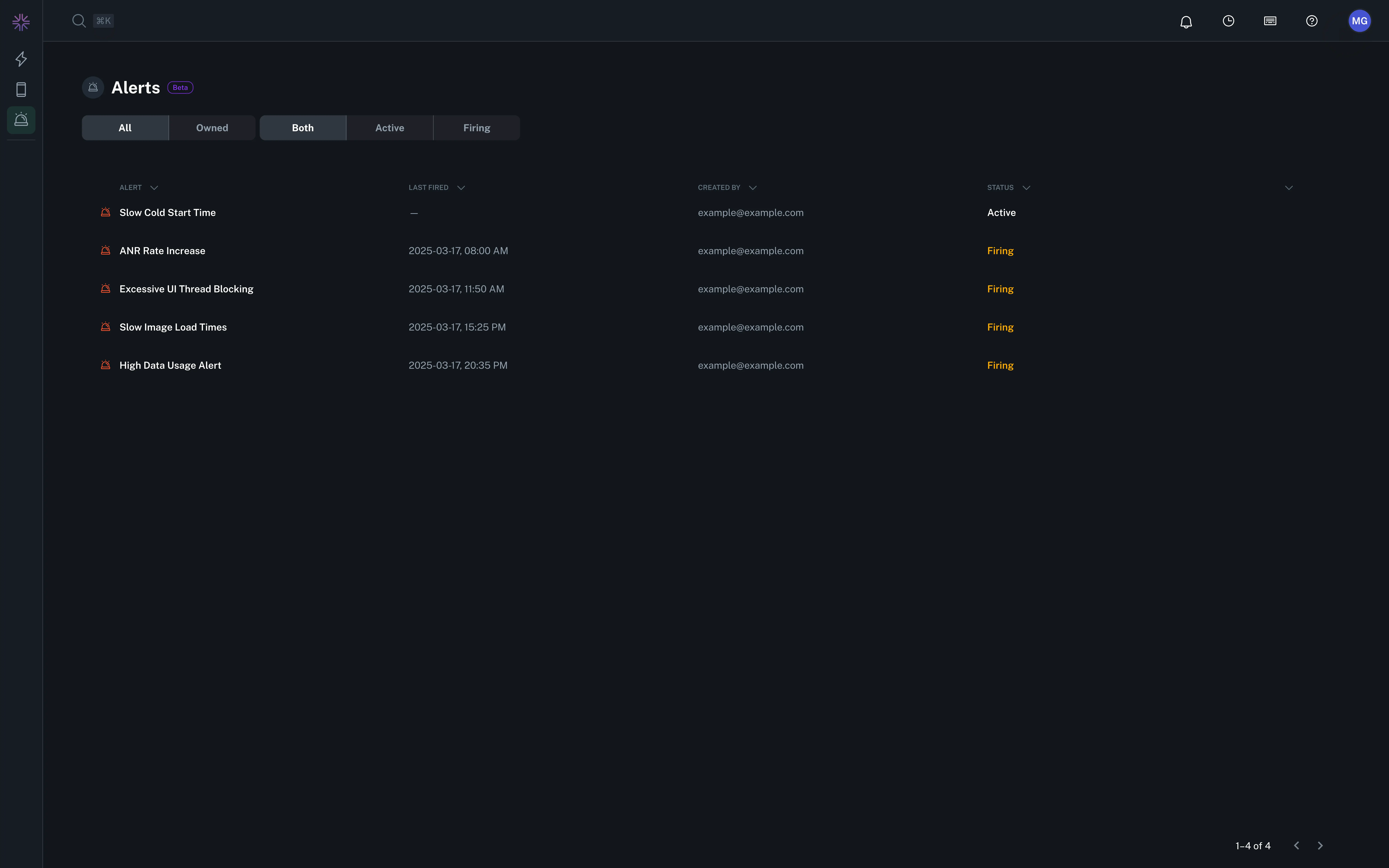 Alerts allow you to monitor specific events using customizable rules. This helps you track potential issues and key application behaviors. Integrate alerts with provider apps like Slack for team collaboration and PagerDuty for incident escalation, grouping notifications (Slack channels and/or PagerDuty services) for streamlined communication.