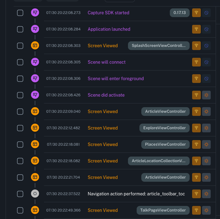 bitdrift enables you to register Screen navigation events with the product, which then shows them in the Timeline view and gives you the ability to leverage them in User Journey Diagrams in bitdrift or simply match on them in workflows.